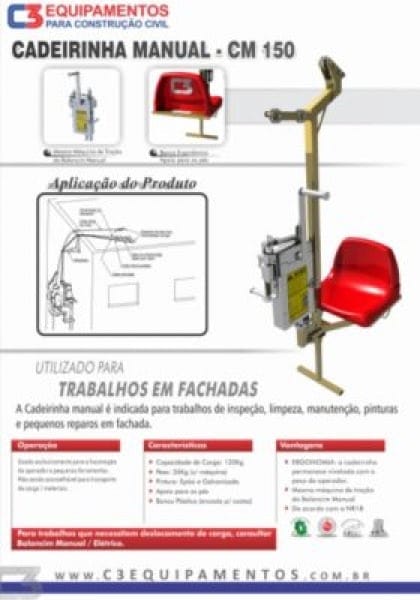 The Manual Hanging Chair or "Individual Rocker" is a simple equipment, but it offers much convenience and safety to its user when working at heights. There are two models, one using ropes and one with wire rope. C3 Equipamentos sells only the model that uses wire ropes because it is safer.