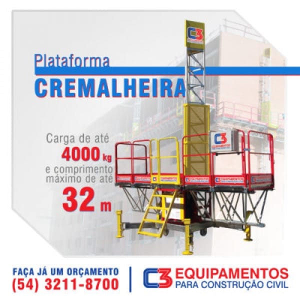 C3 Equipamentos 'Rack Platform es una plataforma motorizada de acceso a fachadas, utilizada para trabajos de construcción, que proporciona una ejecución rápida de servicios y destaca por su seguridad, modernidad y productividad.